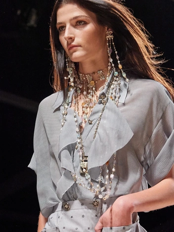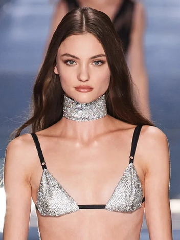 2000-е вдохновляют дизайнеров в этом сезоне. Обилие мерцающих кристаллов было неотъемлемой частью эпохи Y2K. Исключением не стали и дизайнеры Dolce & Gabbana. Мини-юбки с люрексом, прозрачные рубашки, юбки с бахромой из бисера, топы, похожие на нижнее белье и очень явная сексуальность — основные триггеры моды того времени. Доменико Дольче и Стефано Габбана предлагают нам носить стразы со стразами этим летом, а именно, чокеры в кристаллах с такими же лифами.
