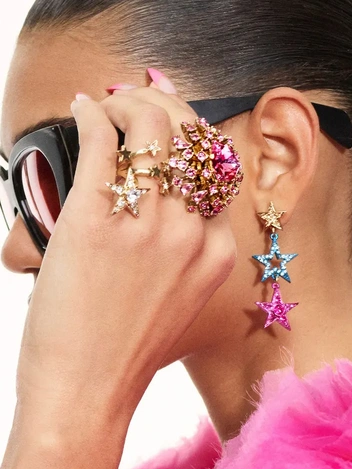 На подиуме в этом сезоне мы видим серьги-люстры с крупными разноцветными кристаллами в лучших традициях 2010-х. Если серег покажется мало, то дополнить образ можно колье и каффами-кристаллами. Вдохновляемся Alberta Ferretti и Giambattista Valli и достаем из шкатулки хиты прошлой декады в знак поддержки культуры осознанного потребления.
