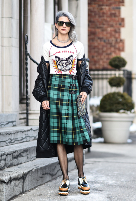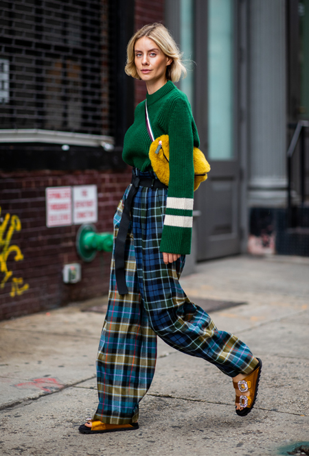 Самые частые гости недель моды — это классические «Caledonia» и «Royal Stewart» красных оттенков, однако и другие вариации тартана — от насыщенно-фиолетового до салатового и ярко-розового — появляются на подиумах и в стритстайл-отчетах с завидным постоянством. Сочетать такой яркий принт можно как с однотонными вещами, так и с другими собратьями-тартанами. Последний вариант — более яркий и смелый, поэтому если пока не готовы к экспериментам, комбинируйте принт с монохромными или приглушенными оттенками натуральной гаммы: хаки, песочным, черным или бордовым.