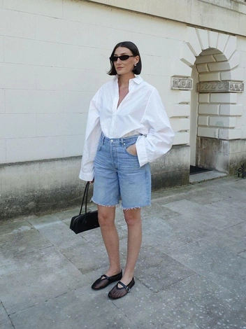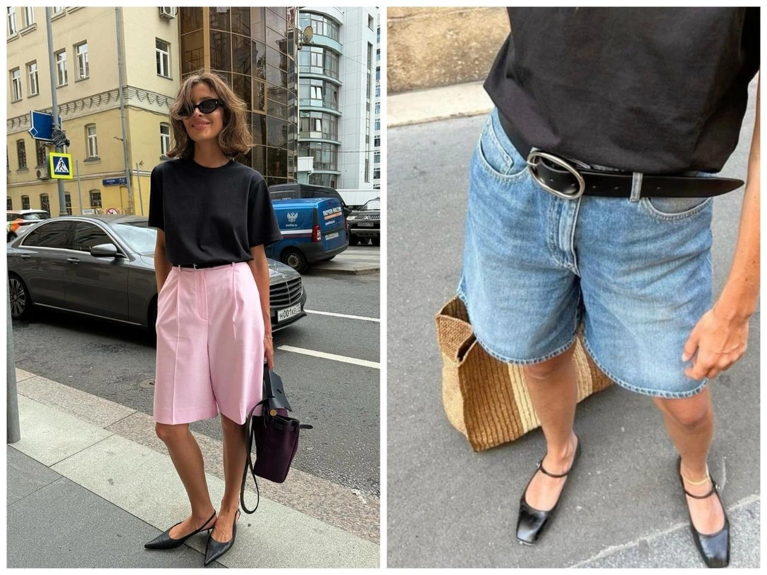 Еще одно актуальное сочетание — с рубашкой свободного кроя (например, из шифона или шелка), она создаст элегантный контраст с бермудами. Дополнить образ можно босоножками на тонком ремешке или мюлями — так лук получится более женственным и непринужденным. Здесь же вполне уместно применить стайлинг-трюк с сочетанием нескольких ремней в одном образе. Если хотите еще усложнить стилизацию, накиньте сверху легкий удлиненный жакет. Не забываем, чем больше в образе вещей разных фактур, тем дольше хочется рассматривать аутфит, а это значит, вы точно не останетесь без внимания (читайте также: 10 предметов мужского гардероба, которые точно стоит забрать в свой образ).