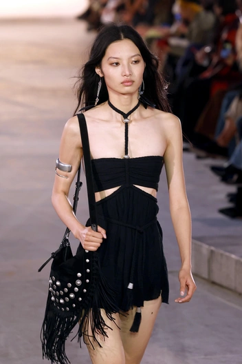 Причем носить все эти вещи проще, чем кажется. Крупные и жесткие браслеты отлично вписываются в образы в стиле бохо, и также легко адаптируются под классику или повседневную одежду. Isabel Marant показали идеальный вариант для наряда современного хиппи с этим аксессуаром. Трикотажные топы и платья с вырезами бренд дополнил «ковбойскими» сумками с заклепками и бахромой, а предплечья моделей украсил широкими обтекаемыми браслетами (читайте также: Какими украшениями дополнить образ в 2025 году: 6 вариантов с подиумов, которые стоит повторить).