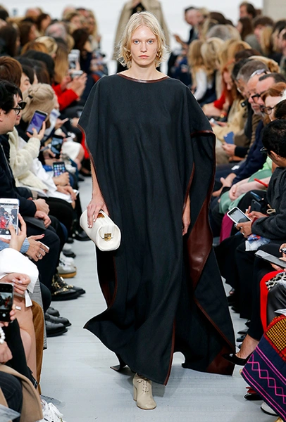 Кроме очевидных цитат из «эры начесов и блеска», вроде безразмерных пиджаков, брючных костюмов в стиле Уолл-стрит, клетки и плиссированных юбок, в коллекции есть детали, которые напоминают о том, что все-таки с 80-х годов в моде случилось еще много всего интересного. Например, у пиджаков и жилетов здесь ассиметричные, в духе деконструктивизма, подолы, а длинные вечерние платья украшены круглыми басками из лакированной кожи. Есть здесь и полюбившиеся всем с прошлого сезона «фирменные» большие пледы. Модели несут их, перекинув через локоть.