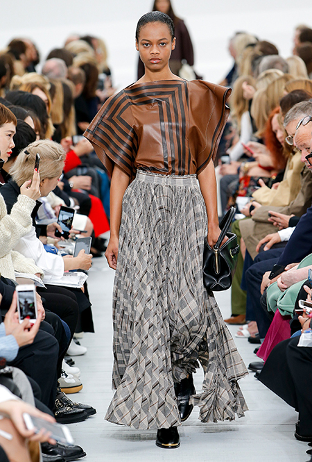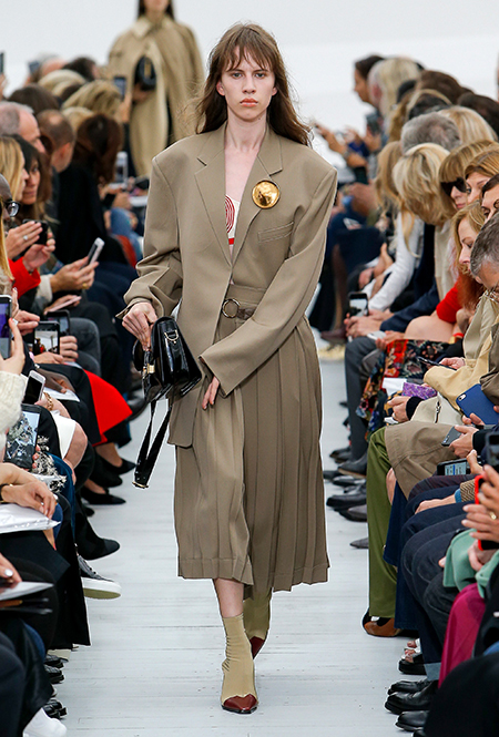 Кроме очевидных цитат из «эры начесов и блеска», вроде безразмерных пиджаков, брючных костюмов в стиле Уолл-стрит, клетки и плиссированных юбок, в коллекции есть детали, которые напоминают о том, что все-таки с 80-х годов в моде случилось еще много всего интересного. Например, у пиджаков и жилетов здесь ассиметричные, в духе деконструктивизма, подолы, а длинные вечерние платья украшены круглыми басками из лакированной кожи. Есть здесь и полюбившиеся всем с прошлого сезона «фирменные» большие пледы. Модели несут их, перекинув через локоть.