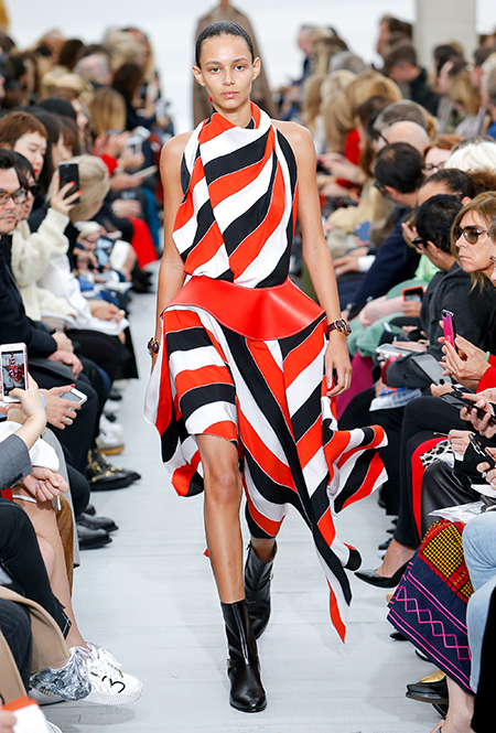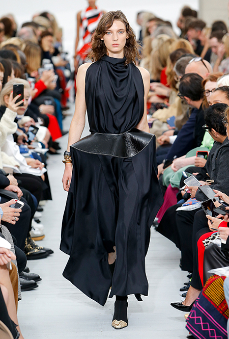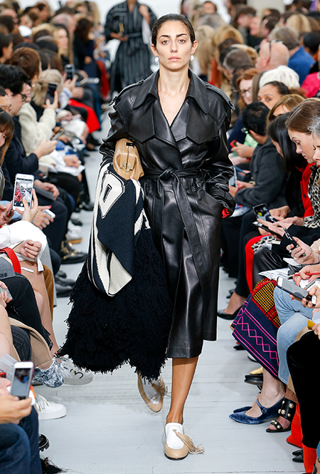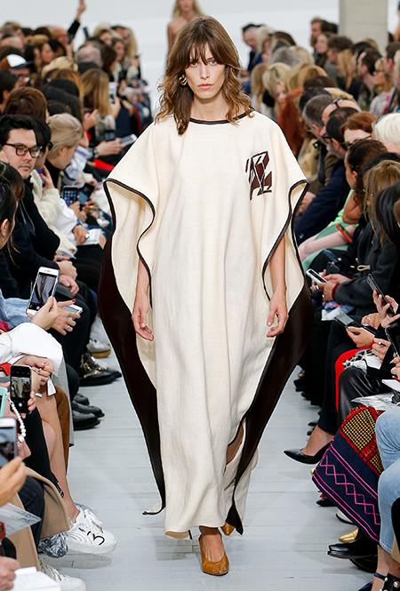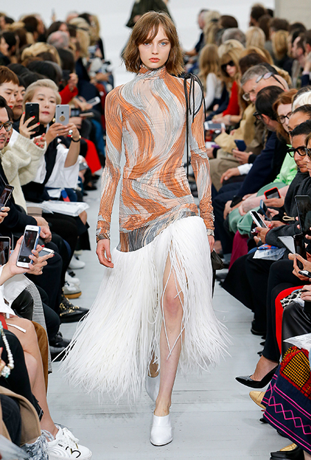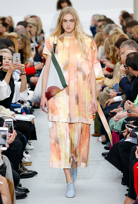 Файло хотела сделать коллекцию яркой и жизнерадостной. Ей это удалось, но с поправкой на ДНК Celine – марки, тяготеющей к минимализму и сдержанности. Желтый, изумрудный, оранжевый, винный – цветов здесь хватает, но все они слегка приглушенные, будто на старой, немного выцветшей фотографии. Впрочем, эффектными вещи делает и работа с текстурами – здесь нашлось место блестящим тканям, гладкой коже и отделке в виде длинной бахромы.