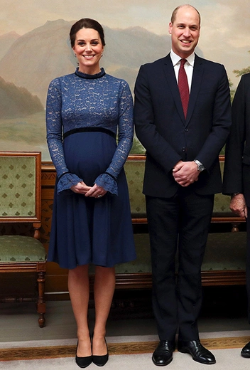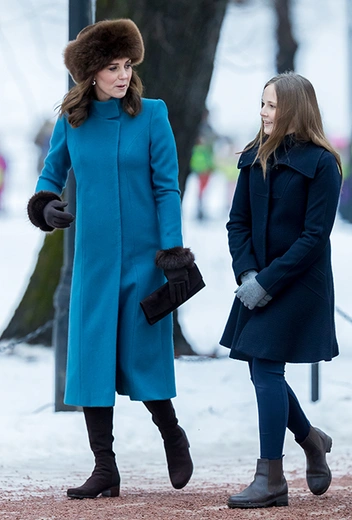 На форуме Royal Foundation герцогиня была в классическом платье также синего цвета от Seraphine. Во время визита в Осло Кейт выбрала голубое пальто.