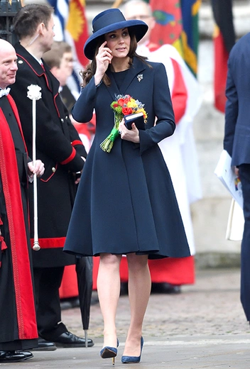 Судите сами: в понедельник на службе Кэтрин была в темно-синих пальто от Beulah London и шляпке от Lock&Co. На прошлой неделе появилась в коктейльном платье Marlene оттенка василька от Seraphine.