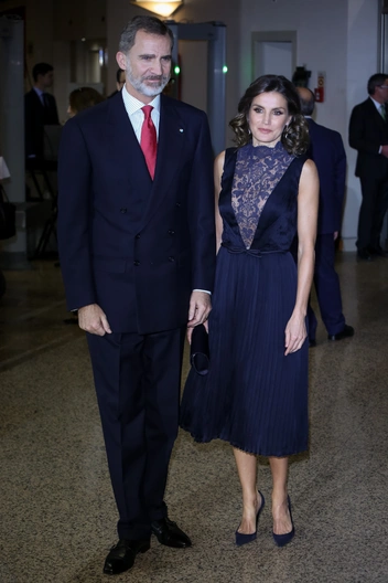Испанская королева Летиция может похвастаться непреложным авторитетом в моде. Что только Летиция ни носила: и брутальную кожу, и легкие мини-платья, и смелые вырезы. Но, пожалуй, самым эффектным и шокирующим был ее наряд для мероприятия в декабре 2018 года. Струящееся вечернее платье в оттенке «королевский синий» (royal blue, как мы помним — главный оттенок королевских особ) с кружевной вставкой в районе декольте — еще один простой способ завладеть всеобщим вниманием.
