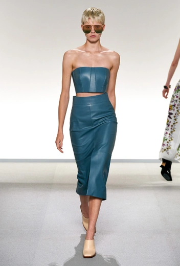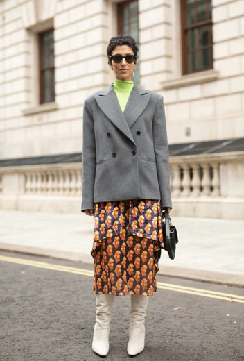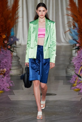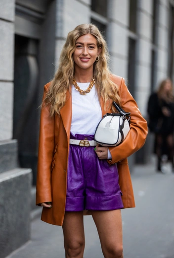 Следом за предметами гардероба из материалов под кожу натуральных цветов появились и модели ярких цветов. Поэтому добавить сочных красок в теплые месяцы будет отличной идеей! Попробуйте разбавить монохромный образ ярким блейзером. Главное – выбрать материал без глянцевого блеска.