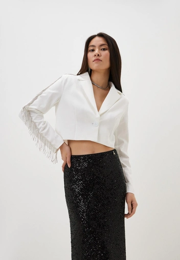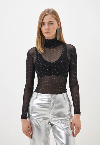 Чтобы составить гармоничный и при этом праздничный аутфит, присмотритесь к лаконичному однотонному верху с декором из страз или пайеток или украсьте футболку, пиджак или топ нательной цепью, повторяющей крой лифа. Если же вы выбираете серебристые кожаные брюки, их мы предлагаем балансировать одеждой в белом, бежевом, черном, хаки или нежно розовом цветах.