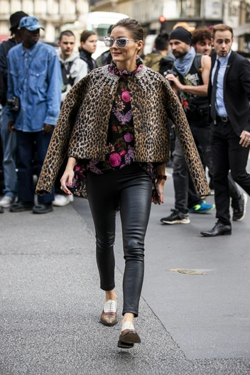 Интересно может смотреться леопардовый принт, но и с ним следует быть осторожной. Во-первых, всегда обращайте внимание на объем рисунка — он не должен быть очень крупным и растянутым. Во-вторых, смотрите на качество материала, так как облегающая шифоновая блуза, скорее всего, не подчеркнет вашу фигуру, а наоборот, покажет недостатки. Лучше отдать предпочтение плотным материалам и маленьким рисункам, тогда образ с кожаными брюками будет выигрышным.
