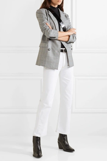 Правило, работающее с любыми предметами гардероба: если не знаете, с чем сочетать вещь, комбинируйте ее с однотонной базой. Она, к слову, у всех разная: если для вас предпочтительнее расслабленный спортивный шик, дополните наряд оверсайз-худи. Если хотите сделать образ с джинсами более формальным, дополните их футболкой без принта и объемным жакетом в классическую клетку. Белые джинсы — идеальная основа для наряда, которая будет намного интереснее привычного синего денима, который многим уже мог поднадоесть.