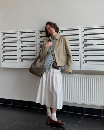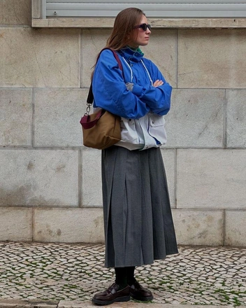 На последнем показе Prada Миучча разрешила нам выглядеть комфортно и расслабленно даже в офисе. Поэтому сочетание спортивной ветровки и юбки гофре в длине макси больше не кажется нарушением делового дресс-кода. На стритстайле находятся и другие сочетания — с брючным костюмом, лодочками с острым мысом, классической рубашкой, лоферами.