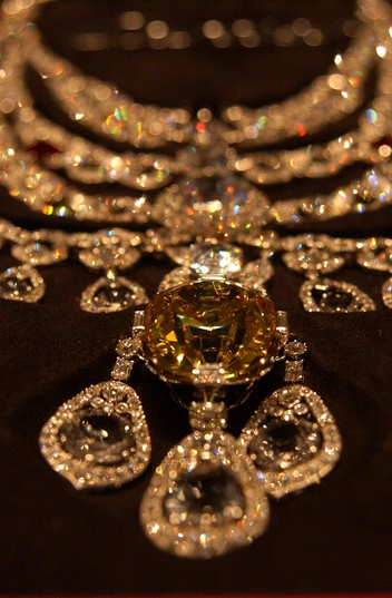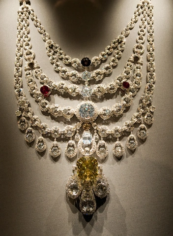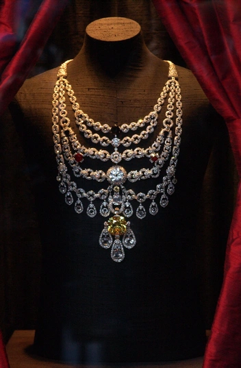 Ремесленники Cartier работали над колье три года. Каскадное платиновое ожерелье состоит из 2930 бриллиантов, в том числе бледно-желтого бриллианта «Де Бирс» огранки «кушон» весом 234,69 карата по центру (седьмой по величине в мире), а также бирманских рубинов. Это официально самый крупный и самый дорогой разовый заказ, когда-либо полученный Домом Cartier (читайте также: 5 самых дорогих украшений Cartier, о которых мечтают все).