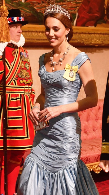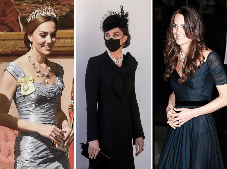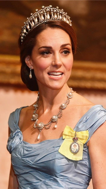 В 1980-х — 1990-х Елизавета II регулярно выходила в свет в ожерелье-чокере из четырех нитей жемчуга с бриллиантами по центру. Камни для изготовления украшения монарху подарили в Японии, а дизайн драгоценности разработал все тот же ювелирный дом Garrard. Пару раз колье надевала и принцесса Диана, а после ее смерти оно долго оставалось нетронутым. Кейт, ставшая новой владелицей украшения, тоже носит его не так часто. Один из самых ярких выходов Кембриджской в ожерелье — появление на 70-й годовщине свадьбы Елизаветы II и принца Филиппа (читайте также: Ювелирная битва: как Меган и Кейт носят украшения Дианы (и кому они идут больше)).