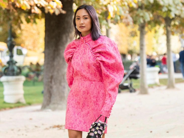 Это плотная ткань с узорами из переплетенных нитей, которая смотрится празднично за счет выразительного рисунка и переливов на свету. Несмотря на изысканный вид, жаккард — сложный материал, который может состарить вас нас на несколько десятков. Кроме того, из-за плотности ткани образы выглядят тяжелыми и громоздкими.