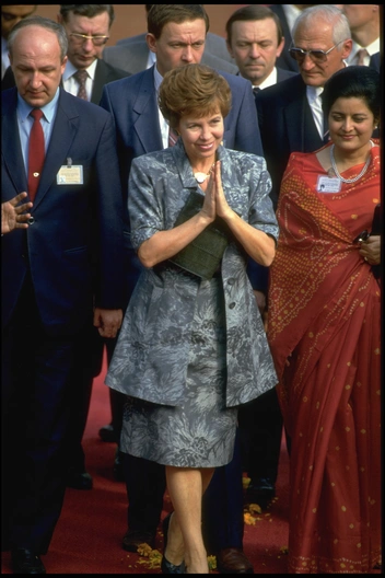 Раиса Горбачева — первая супруга главы государства, которая понимала важность моды и умела одеваться элегантно. Советские женщины обвиняли ее в расточительности и считали, что наряды для нее отшивает Ив Сен-Лоран, но сама Раиса все нападки отвергала и говорила, что образы для нее создают модельеры Дома моды на Кузнецком мосту. «Я не шила ни у Зайцева, ни у Ив Сен-Лорана, как пишут про меня. Одевала меня портниха из ателье на Кузнецком Мосту. Никаких спецателье у меня не было», — рассказывала она (читайте также: Красные королевы: судьба самых ярких советских манекенщиц).