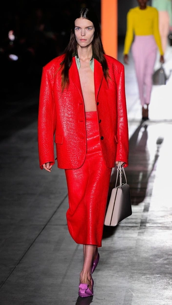 Кожа — горячая тенденция, которую подхватывают модельеры во всем мире. Она способна придать женщине силу и сексапильность, вот почему материал так полюбился итальянским маркам. Они показали в осенне-зимних коллекциях кожаные костюмы, плащи, отдельные вставки в одежду или тотал-луки. Однако отличились дизайнеры Bottega Veneta: тренд представил плетеные сумки в фирменном стиле и сапоги, связанные из кожи спицами.