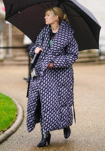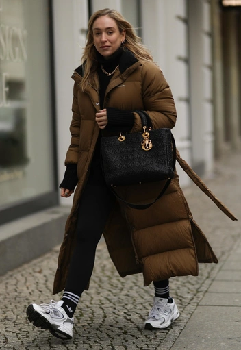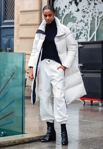 Пуховик-халат предполагает, казалось бы, выбор такой же легкой, расслабленной обуви. Однако подобная демократия приводит к тому, что из-под подола стритстайлера мы можем увидеть даже шпильки — и это выглядит гармонично.