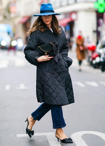 Стеганый пуховик наиболее приближен к понятию «классическое пальто», поэтому он почти универсален. Выбираем ботинки на грубой подошве, жокейские сапоги, изящные туфли, кроссовки — любой вариант обуви подойдет.