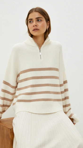 Для создания спокойных минималистичных аутфитов стоит выбрать свитер в базовых тонах. Песочные, молочные, черные и серые модели легко вписать в любой образ и гардероб. Их можно использовать как для создания многослойных образов, например, сочетая свитер на молнии с футболкой или водолазкой или надевая модель с высоким воротом под oversize-пиджак, а также использовать трикотаж в качестве основного предмета аутфита (читайте также: Сберегите деньги: как собрать полный базовый гардероб всего за 30 тысяч рублей)