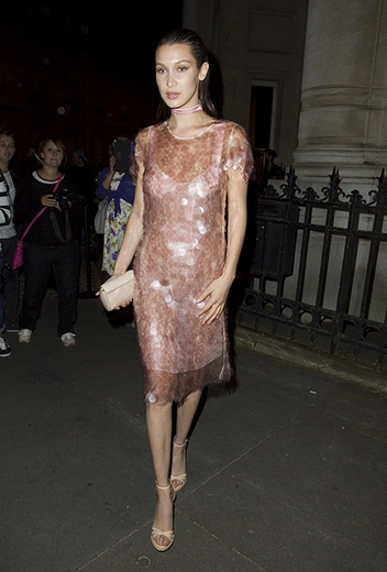 Несколько блестящих вещей в одном образе – это вполне нормально, а вот сверкающая одежда и массивные украшения – не лучшее сочетание. Если вы надели блестящее платье, то колье или сотуар с крупными камнями лучше оставить дома в шкатулке. Допускаются лишь элегантные серьги в тон, «невесомые» цепочки, неброские браслет и тонкие кольца, как у Тессы Томпсон. Можно взять пример с Беллы Хадид и дополнить платье в пайетках чокером или шелковой лентой того же цвета.