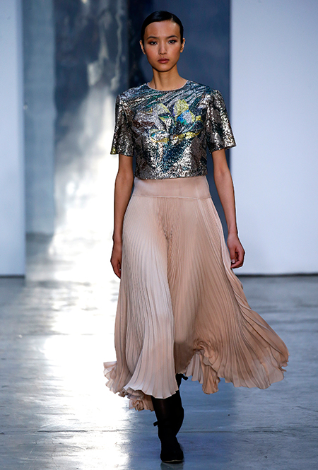 Ориентируемся и на Тейлор Свифт. Для одного из концертных выступлений она выбрала total look от дизайнера Джессики Джонс. Джемпер здесь вышит крупными пайетками, топ – мелкими блестками, а юбка – просто из гладкой «металлизированной» ткани. Разные фактуры хорошо дополняют одна другую и помогают избежать избыточности.