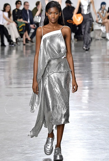 Традиционно считается, что блестящие вещи нужно уравновешивать минималистичными, если не сказать строгими, аксессуарами. Но в последнее время этому «правилу» не следуют ни дизайнеры, ни звездные стилисты. Что на подиуме, что на красных дорожках, блеск чаще всего дополняют… блеском. И это совсем не смотрится вульгарно. Особенно если сверкающие вещи в одном образе - разных цветов, фактур или стилей. Как, например, на показе Paco Rabanne FW17, где длинные платья из мерцающей серебристой ткани креативный директор Жюльен Доссена замиксовал с массивными лоферами цвета «металлик». Похожий путь выбирает Карл Лагерфельд для Chanel: блестящие неоново-фиолетовые жакеты из того же сезона он дополняет «серебряными» сапогами с широким голенем.
