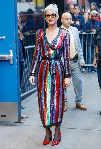 И, разумеется, минималистичные дополнения к блестящим вещам могут быть яркими – этот вариант, пожалуй, самый интересный. Лично нам больше всего нравится образ Кэти Перри в сверкающем платье цвета радуги и ярко-алых туфлях на каблуке на прогулке в Нью-Йорке.
