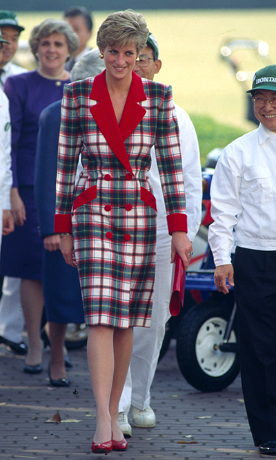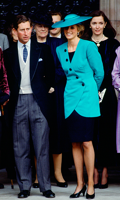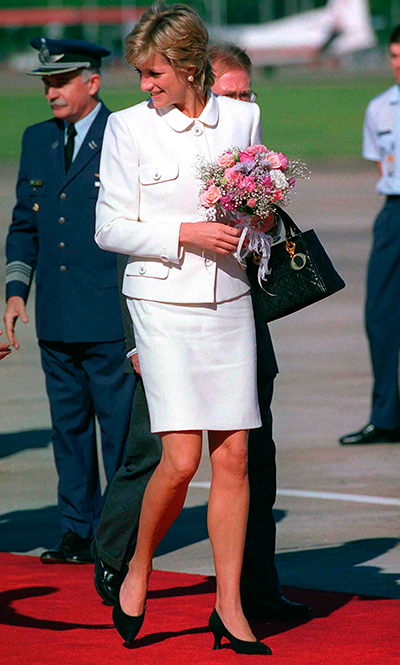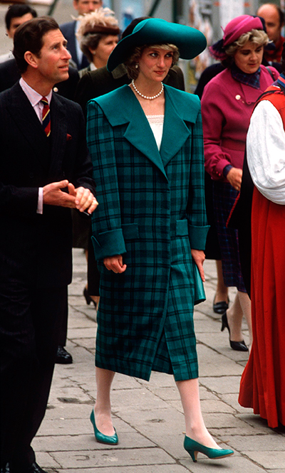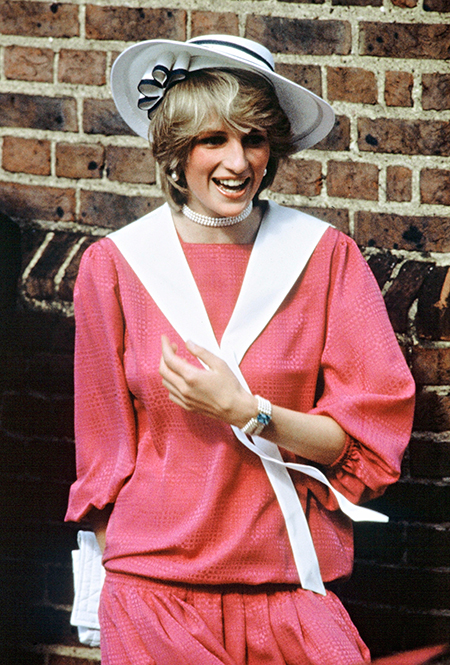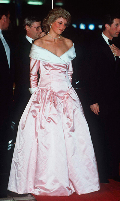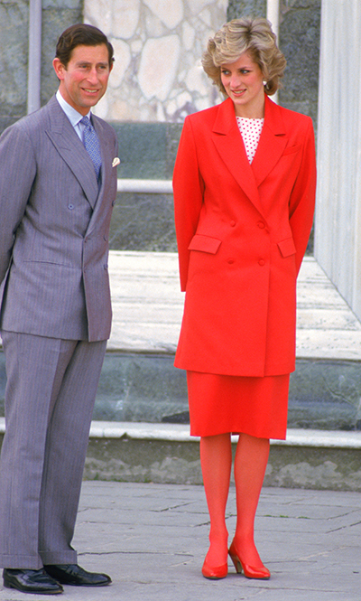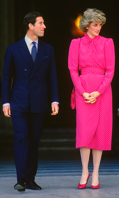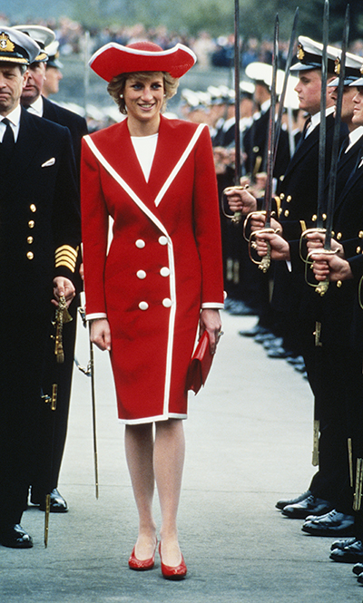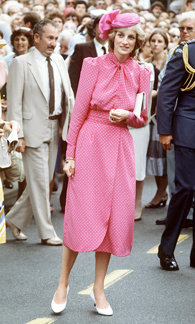 В 80-х годах гардероб «династической Ди» (так ее именовали в прессе во время замужества с Чарльзом) включал несколько очевидных характеристик. Это, к примеру, наличие декоративных деталей, которые переносили акцент с узких бедер и широких плеч Дианы: бантики, элегантно завязанные на шее, атласные ленты на чуть завышенной талии и приподнятые «фонариком» рукава — любимый модный прием принцессы. С другим проявлением нестандартности фигуры — высоким ростом в 178 сантиметров — она справлялась при помощи балеток и «kitten heels», незаслуженно вытесненных из моды высокими каблуками. Все это чаще всего подбиралось под один-единственный цвет — синий, розовый или красный, на котором Диана настаивала вне зависимости от повода или тренда.