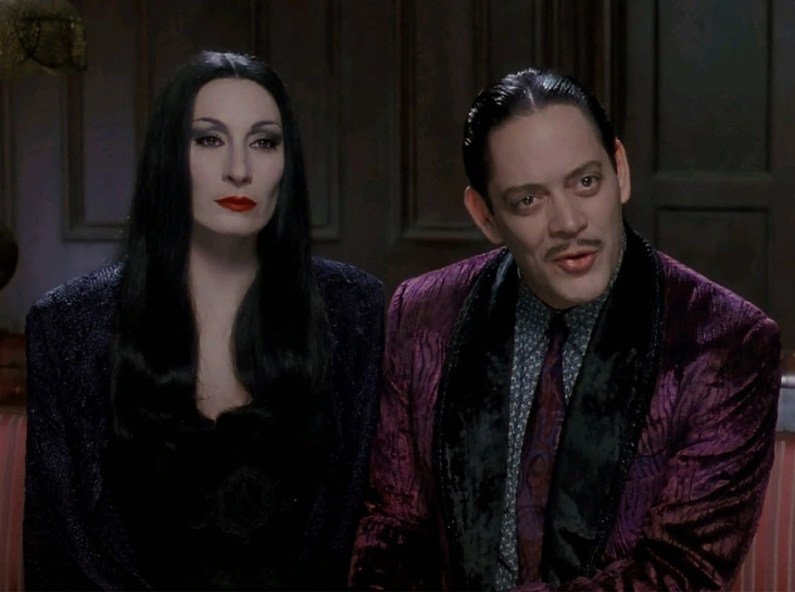 Во время съемок тяжелее всего было Анжелике Хьюстон, исполнительнице роли статной и элегантной Мортиши с длинными черными волосами, ярким вечерним макияжем, идеальной осанкой, плавной походкой и узнаваемым готическим нарядом в пол.