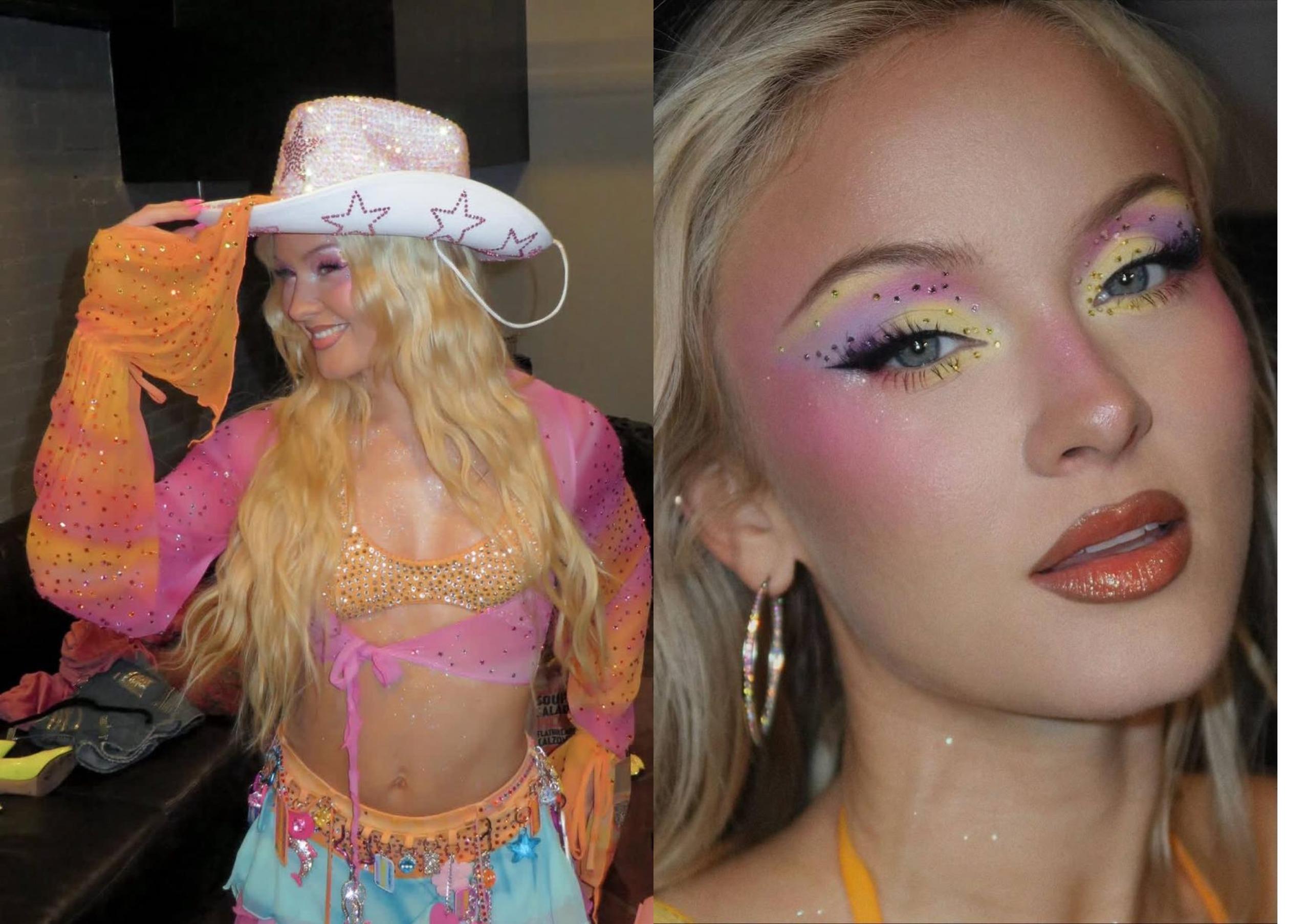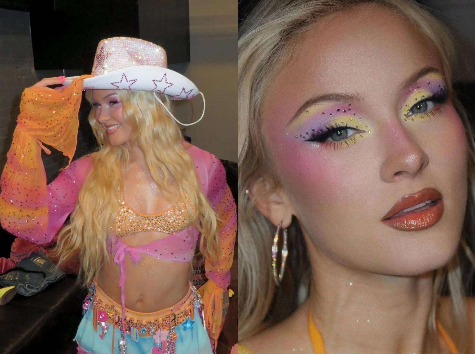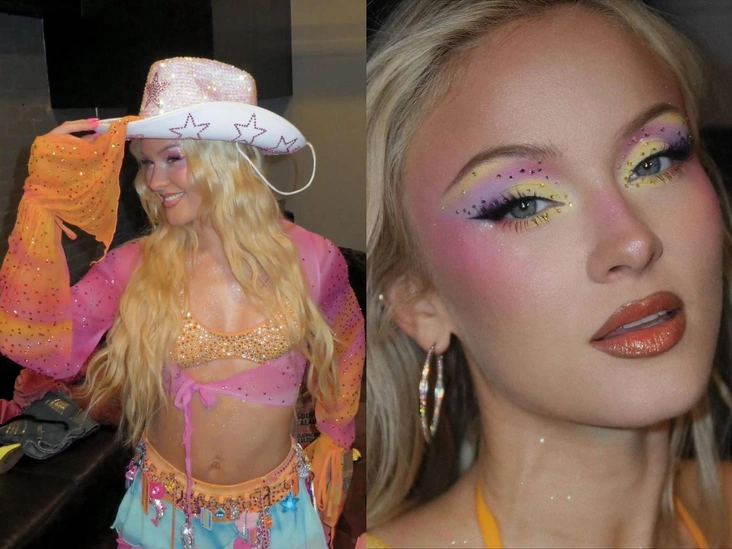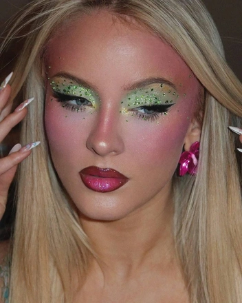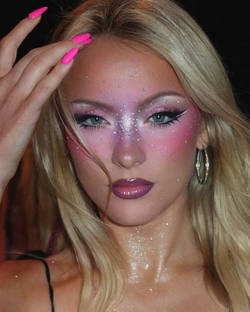 Начнем, пожалуй, с главных достижений в плоскости интернета. Образ Ларссон называют одной из причин, по которой зумеры вдруг развернулись от эстетики clean girl и «тихой роскоши» в сторону тотального максимализма. Например, в тиктоке долгое вирусились яркие макияжи артистки, особенно выполненные в неоновых оттенках. Поклонницы Зары моментально подхватили это веяние, повторяя самые сложные мейкапы самостоятельно, а заодно и скандируя, что нам пора забыть о «макияже без макияжа», вернуться к трендам 2016-х годов и дать волю своей фантазии. Вскоре тенденция распространилась и на бьюти-блогеров, которые охотно взялись экспериментировать с самыми яркими и эффектными образами.