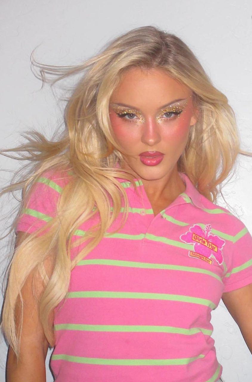 То же касается и одежды. Пожалуй, главное, с чем ассоциирован ее стиль — новый альбом Midnight Sun, вышедший в прошлом году. Специально к нему Зара выстроила вокруг себя эстетику Y2K: она носит стразы и пайетки, самые яркие цвета, заниженные талии и микро-топы, принтованные купальники и рюши. Все это составляет основу ее гардероба. Например, на церемонии «Грэмми-2026» Зара Ларссон появилась в золотом платье от Kevin Germanier с блестками, асимметричным верхом и юбкой — это ли не настоящая дань нулевым.