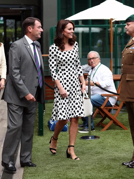 Покровительница Всеанглийского клуба лаун-тенниса и крокета явно любила носить Dolce & Gabbana на Уимблдон. Это белое платье в крупный черный горох она надела в день открытия чемпионата 2017 года.