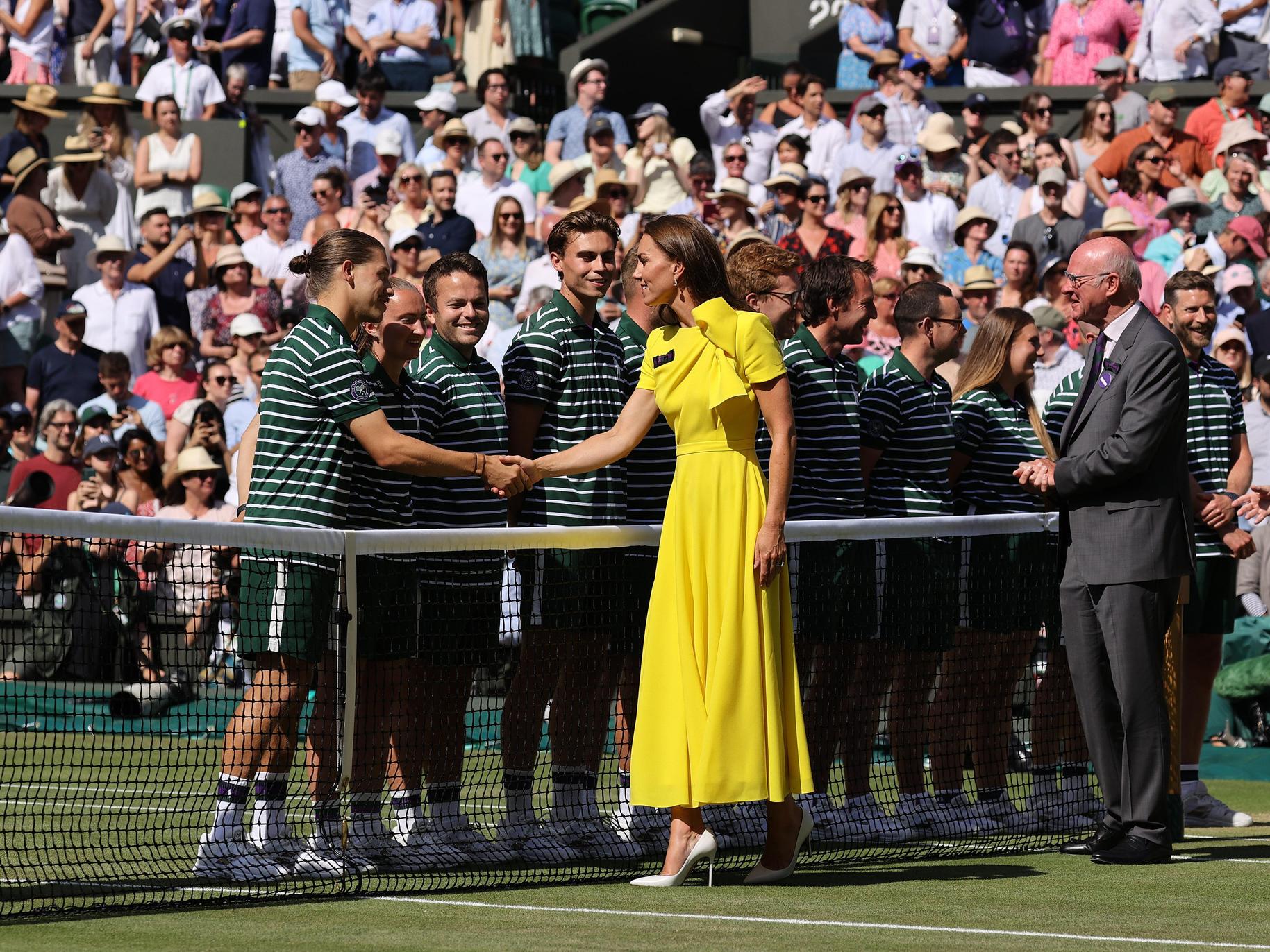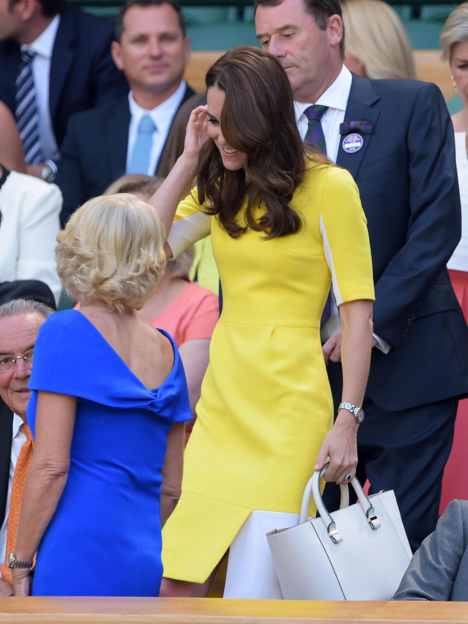 В тринадцатый день Уимблдона королевская особа появилась на трибунах в ярко-желтом платье Roksanda Ilincic, в котором уже видели ранее в том же году во время визита на Карибы. Это был редкий случай, когда герцогиня была замечена в шляпе.
