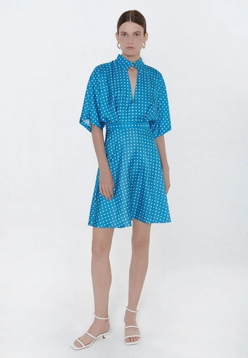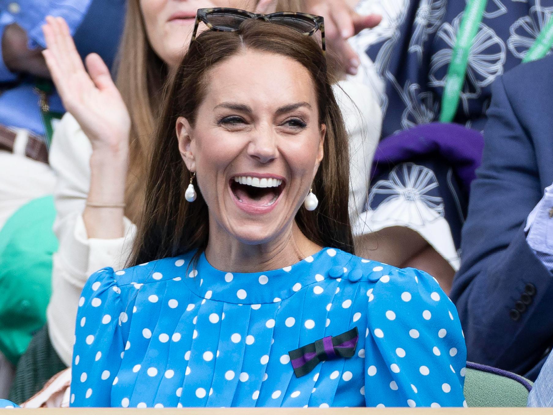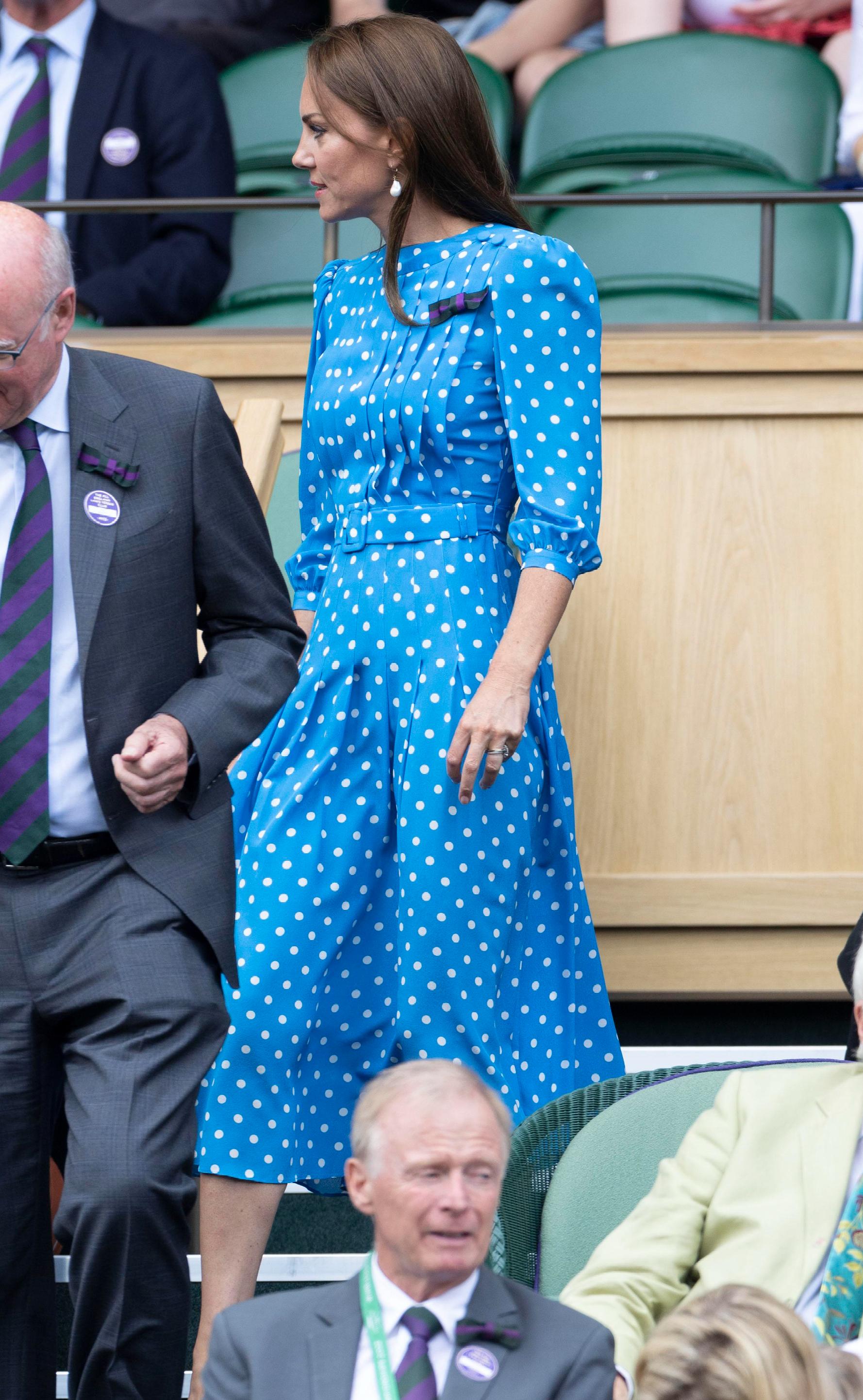 Кейт была одета в плиссированном платье миди из голубого шелкового крепдешина в горошек одного из ее любимых брендов — Alessandra Rich, пока они с мужем наблюдали за игрой Джоковича из королевской ложи в девятый день Уимблдонского чемпионата.