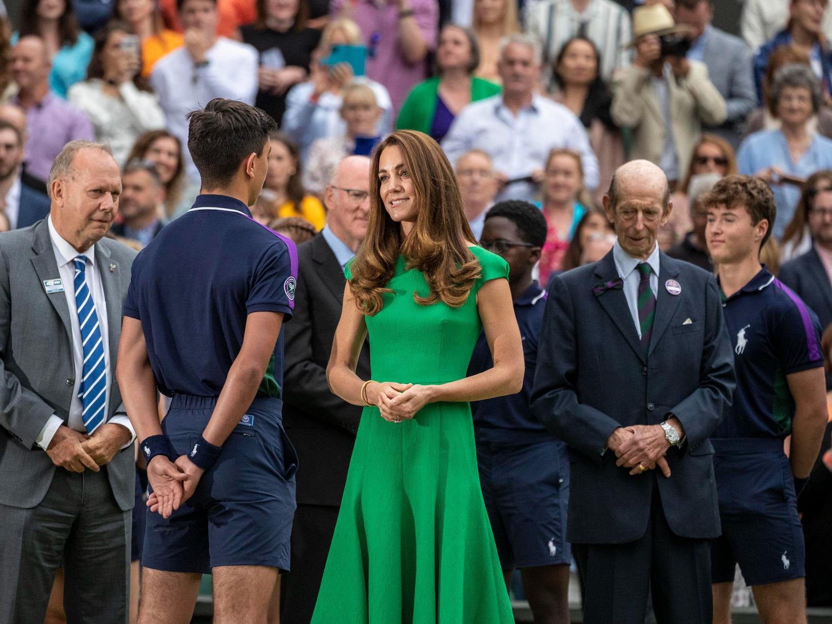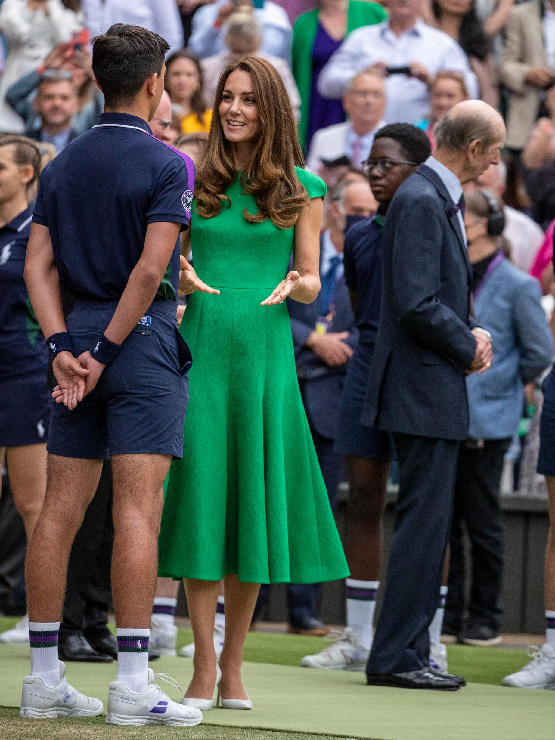 Кэтрин надела платье Alessandra Rich в горошек, чтобы вручить Новаку Джоковичу Уимблдонский трофей после его выигрыша в финале мужского одиночного разряда. Кембриджские наблюдали за матчем со своим старшим сыном принцем Джорджем.