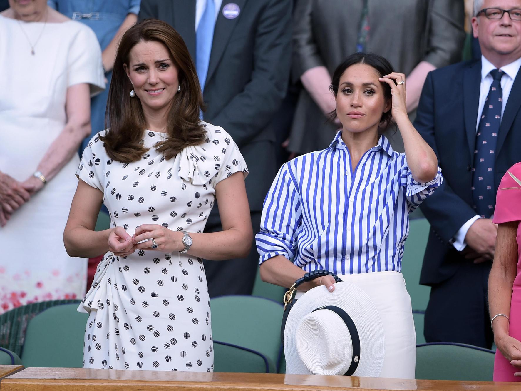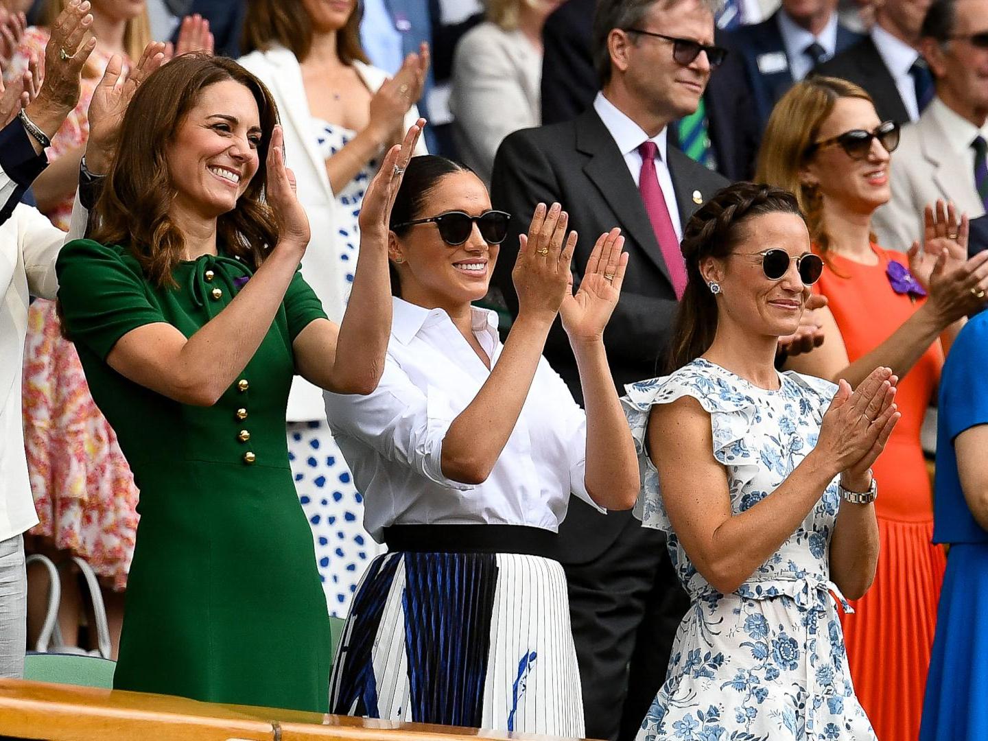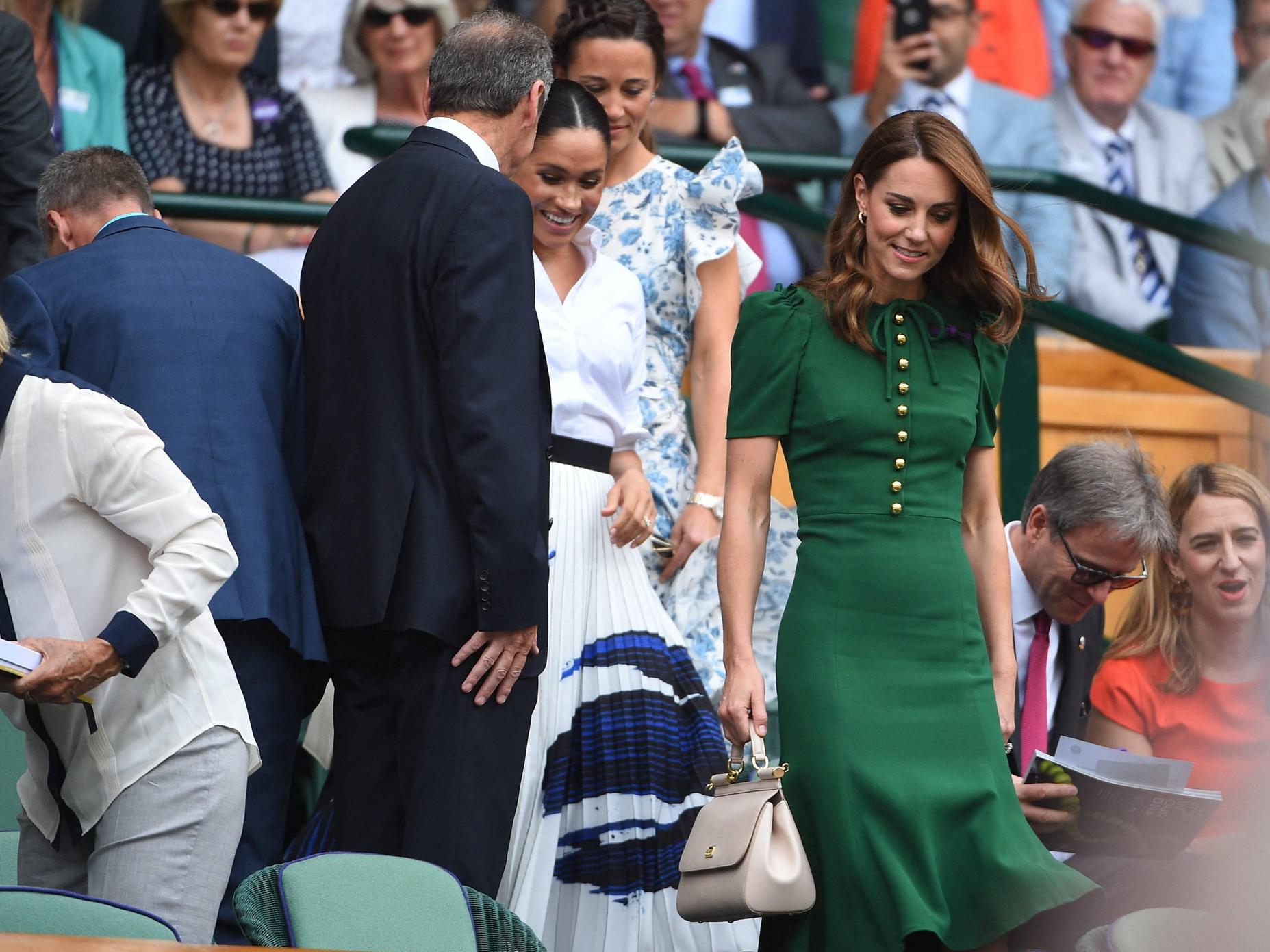 Днем раньше состоялся исторический выход, которого ждали многие королевские поклонники — новоиспеченные невестки Меган и Кейт впервые появились на мероприятии вдвоем. Вместе Их Высочества наблюдали за состязанием Новака Джоковича и Рафаэля Надаля в 12-й день турнира. Для этого дня Кембриджская выбрала монохромное платье Jenny Packham в горошек и сумку Dolce & Gabbana, с которой она будет присутствовать на Уимблдоне и в следующем году, а Сассекская объемную рубашку в полоску и белые брюки.
