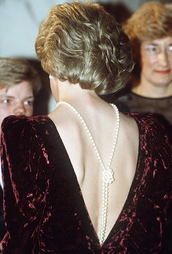 Больше чокеров с самоцветами Диана любила только чокеры из жемчуга — тем интереснее и необычнее казался выбор принцессы, когда она появлялась на публике с длинной жемчужной нитью. А уж если Ее Высочество носила ожерелье на спине, как она продемонстрировала это в 1985 году, то мир и вовсе не мог оторвать от нее глаз.