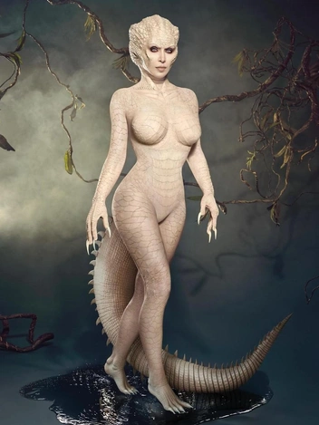 Еще один жуткий образ получился у Ким Кардашьян — кажется, она решила устроить негласное соревнование с Хайди Клум. Уверены, на создание такой брони ушло приличное количество времени, но результат впечатляющий. Селебрити вдохновилась редчайшим белым аллигатором.