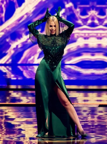 Латвийская исполнительница Саманта Тина в финал не прошла — однако это не помешало ей войти в историю образов прошедшего «Евровидения». Звезда взяла за основу глубокий изумрудный оттенок, который не так часто появляется на сцене песенного конкурса. Образ Саманты завершал щедро декорированный топ на платье, длинные перчатки и эффектный вырез на юбке.