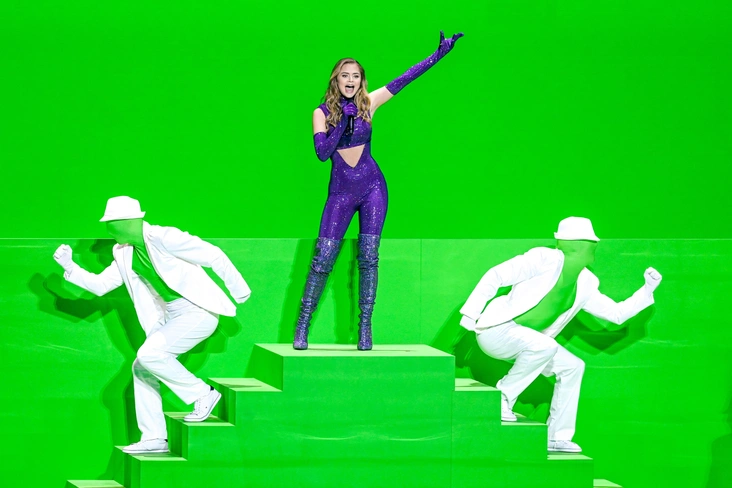 Греческая исполнительница Стефания решила больше внимания удалить сценографии шоу, однако и образ для выступления получился довольно яркий. В ход пошли пайетки, которыми певица была усыпана с ног до головы: звезда выбрала насыщенный фиолетовый комбинезон, который эффектно контрастировал с неоново-зеленым хромакеем, который стал фоном для ее перформанса.