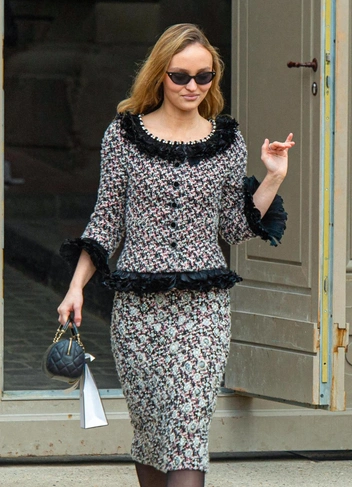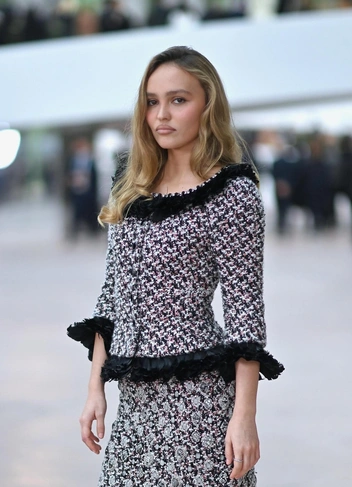 Продолжая парад имени Коко Шанель, классический твидовый костюм французского бренда выбрала Лили-Роуз Депп. Приталенный жакет с черными оборками и юбку карандаш актриса надела с серыми босоножками и (против всех правил) черными капроновыми колготками (читайте также: Модные колготки зимы 2024/25: цветные, со стразами и в сетку).
