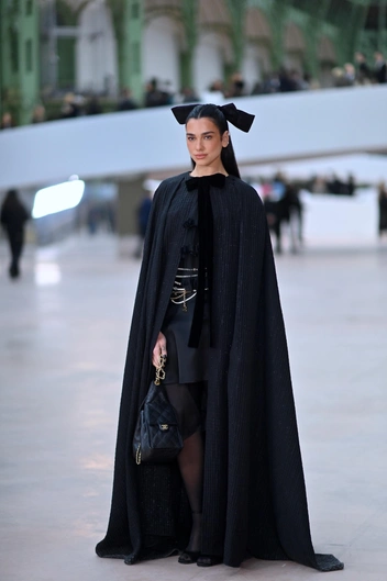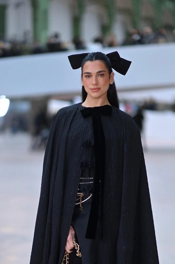 Одна из самых модных певиц современности, Дуа Липа, посетила кутюрные показы в тотал-блэк образе Chanel. Мини-юбку и черный топ звезда дополнила длинной мантией и жемчужными бусами на поясе. А главным акцентом в наряде стали объемные бархатные банты на шее и в прическе.