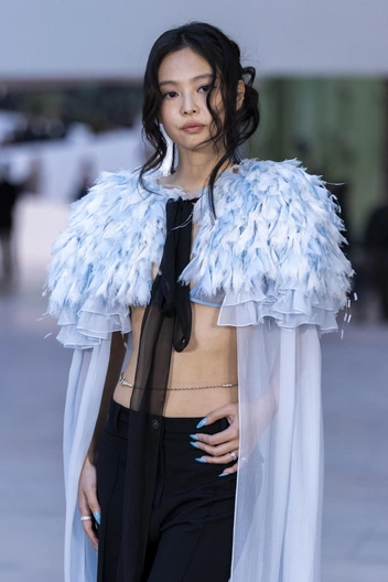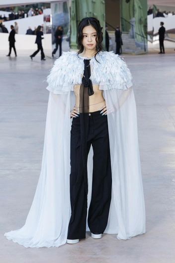 K-pop певица Дженни Ким (которая, кстати, амбассадор Chanel), кажется, сделала все возможное, чтобы занять первое место в топах лучших образов текущей недели моды. Девушка надела развевающуюся нежно-голубую накидку поверх кружевного бра и черных костюмных брюк. А идеальный пресс она украсила тонкой цепочкой, повязанной вокруг талии.