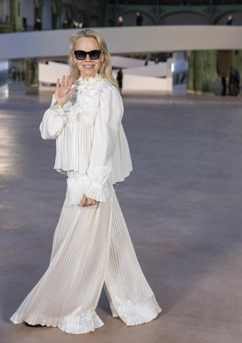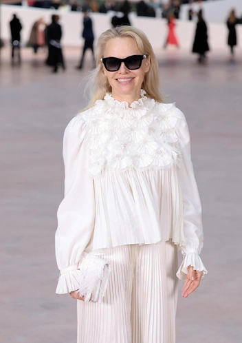 Памела Андерсон покоряла поклонников белоснежным нарядом по пути на показ Chanel. Широкие брюки-плиссе звезда «Спасателей Малибу» надела вместе с необычной блузой. Ее объемные рукава украшали пышные манжеты в складку, а на груди крепились детали с оборками.