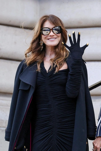 Карла Бруни блистала в роскошном черно-золотом образе в стиле old money. Объемное пальто модель сочетала с драпированным платьем, остроносыми лодочками и строгой сумкой. Однако все внимание забрали себе стильные аксессуары: крупные солнцезащитные очки, кружевные колготки, массивные серьги и перчатки с деталями в виде золотых ногтей.
