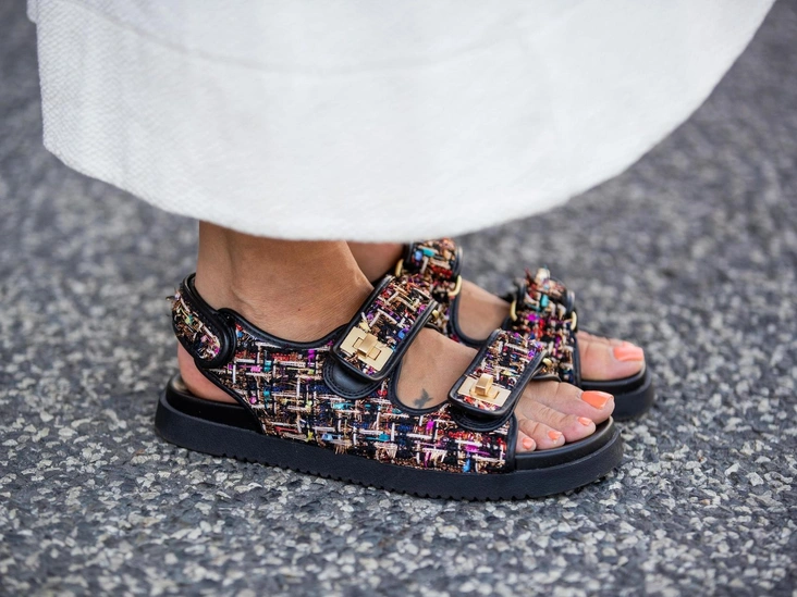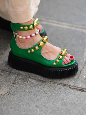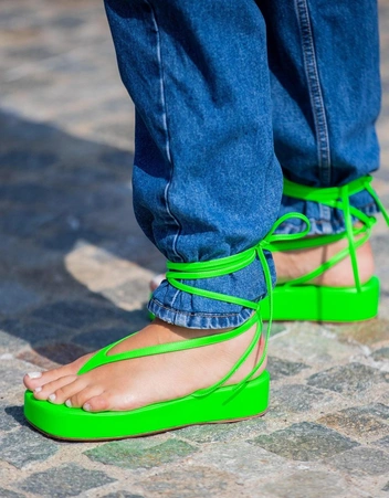 Неоновые цвета актуальны только на туфлях и босоножках, броские же сандалии будут выглядеть старомодно и напоминать 2010-е годы. Более того, такую обувь сложно вписать в летний гардероб, когда ваша одежда становится яркой и пестрой (читайте также: От босоножек с декором до сандалий-гладиаторов: 10 антитрендов летней обуви).