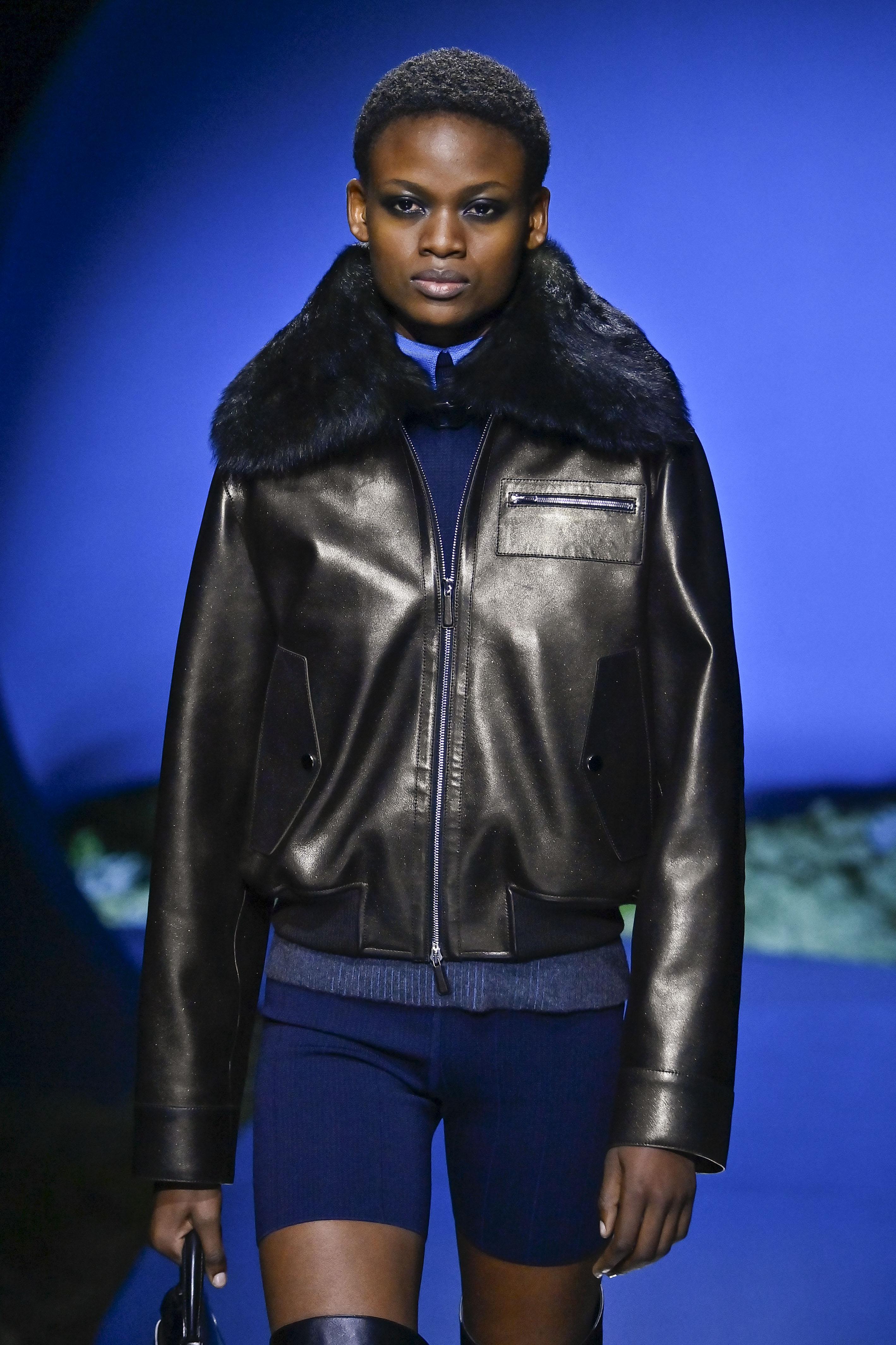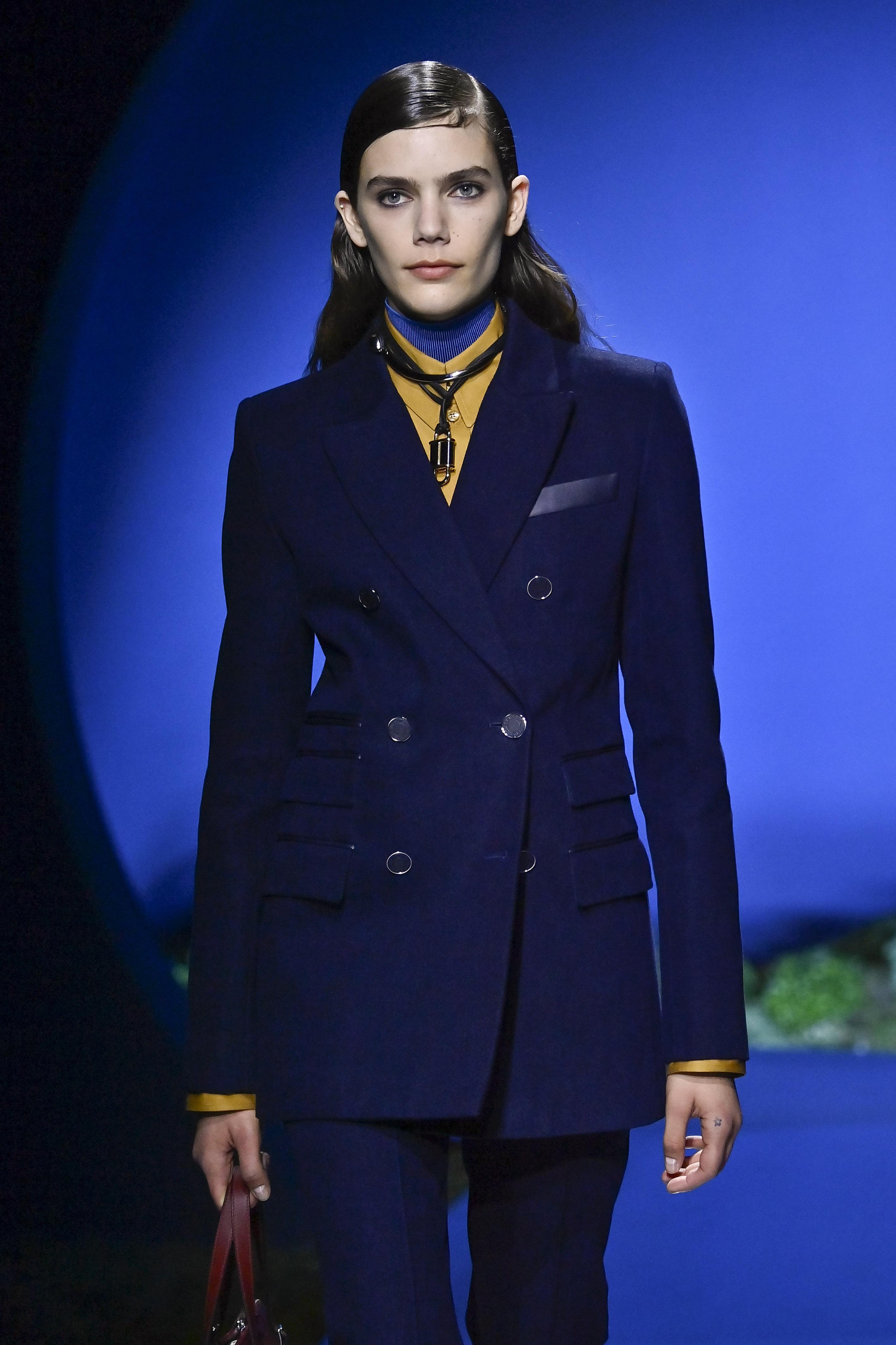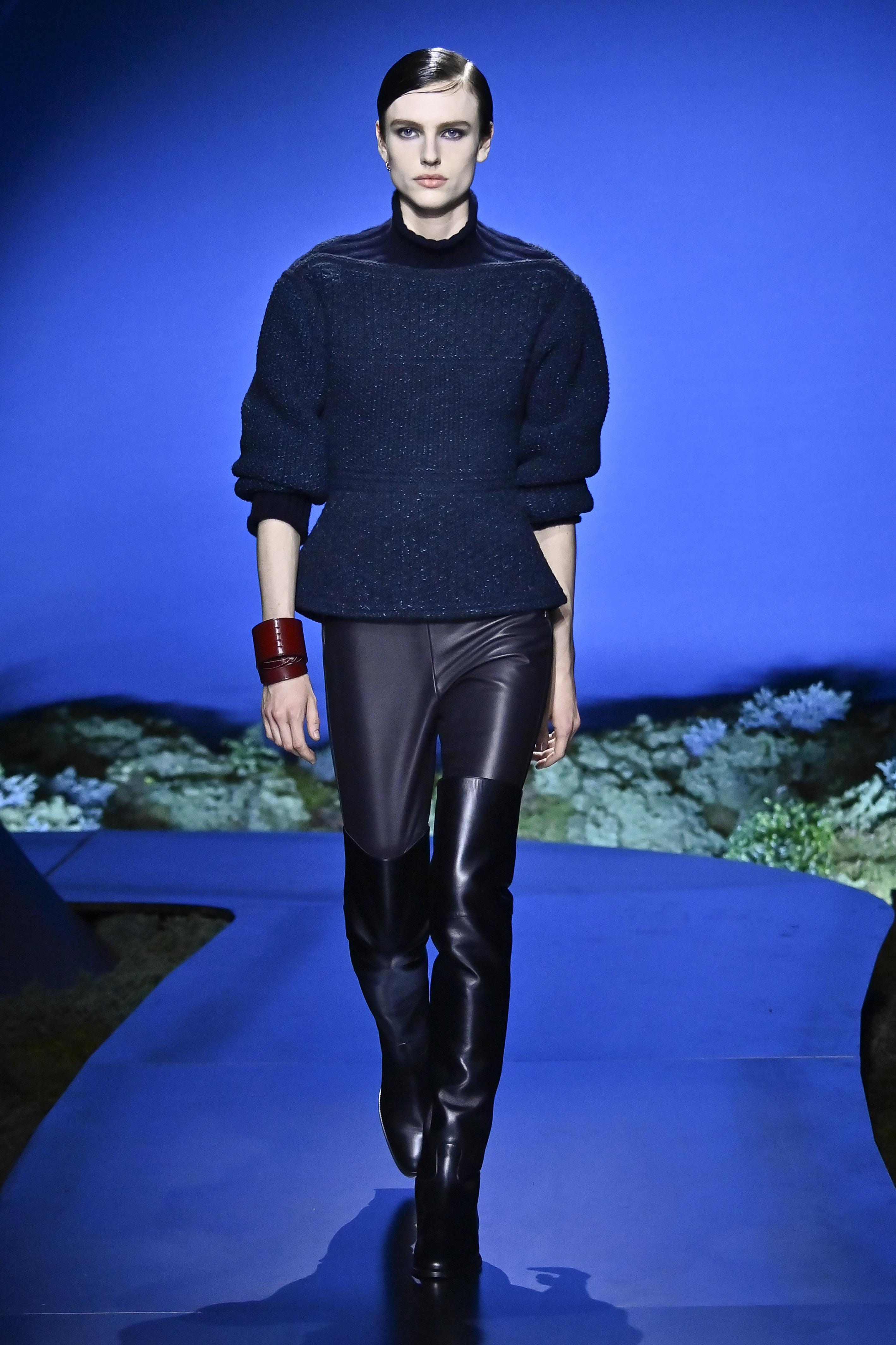 Hermès аккуратно возвращают нам именно это состояние, только вместо футуристичного дома Калленов — манеж Garde Républicaine, превращенный в лес при луне, а вместо школьной куртки — кожаное платье глубокого синего оттенка, которое на теплом свету кажется мягким, а в холодном — почти стальным. Тот же эффект «между»: между днем и ночью, между детством и взрослой жизнью, между «еще можно все отменить» и «уже поздно передумать».