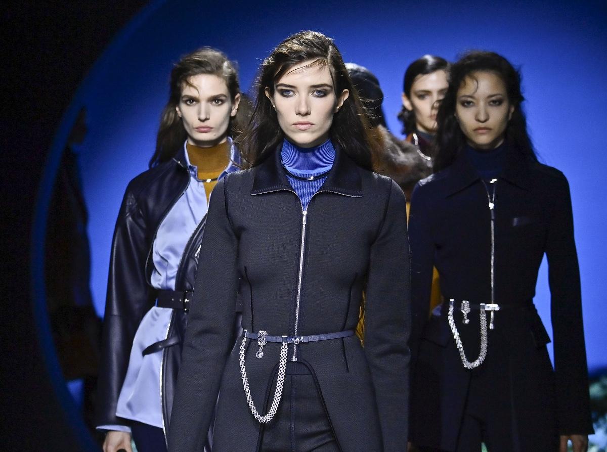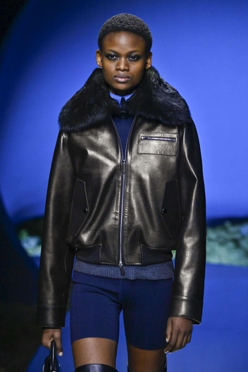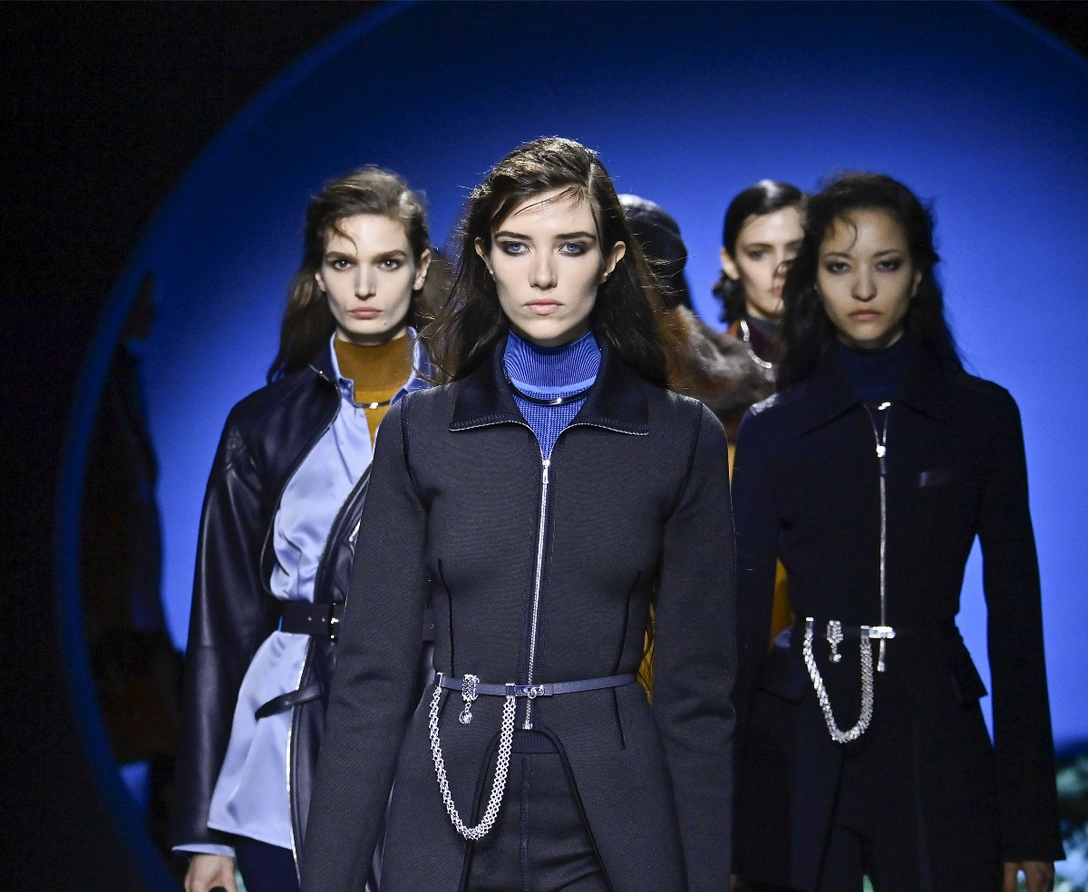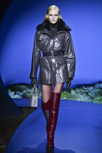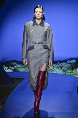 Брендовые вещи выходят как продолжение этой сцены: острый, почти аэродинамический крой, мини, которые вместе с ботфортами вытягивают силуэт моделей, кожаные плащи, в которых легко представить ночную прогулку по городу, где фонари еще не успели включить на полную мощность. Палитра чуть темнее привычной осенней классики: густые синие, лесные зеленые, глубокие бордо, угольные оттенки, в которые время от времени впиваются неожиданные акценты желтого или лаймового — как луч света, пробившийся через облака в самый подходящий момент (читайте также: Самые модные цвета 2026 года: 5 оттенков, которые должны быть в гардеробе у каждой).