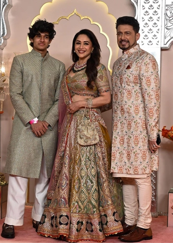 Приглашенный на свадьбу актер Санджай Сатт, который остановился на темном национальном костюме, выглядел солидно, борясь за восхищенные взгляды с индийской актрисой Мадхури Дикшит. Знаменитость поразила папарацци не столько выбранным нарядом, сколько потрясающей фигурой — из-за осиной талии и крепких рук сложно сказать, что такой подтянутой и стройной Мадхури не так давно исполнилось 57 лет (читайте также: «Как они это сделали: звезды старше 40, которым удалось сохранить идеальную фигуру»).